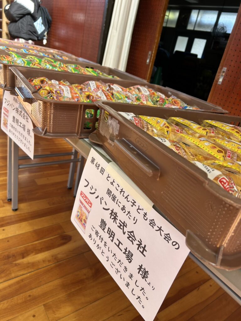 また、今回の子ども大会では、豊明市社会福祉協議会を通じ、フジパン株式会社より菓子パンのご寄付をいただきました。ありがとうございました。